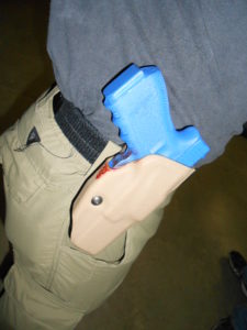 Stay away from the small of the back holsters. The drawstroke is difficult to do in any position but standing and is easier to stop in a fight. There is a greater chance of spinal injury if you fall while wearing one. It also prints horribly if you bend forward. For more information on this type of holster, read Don’t Dig The Rig Part 9.