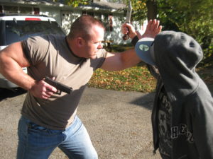 Extending the gun into a traditional shooting stance while within arms reach of your attacker is a recipe for being disarmed. Close range attacks require a different skill set…one that most shooters don’t practice nearly enough.