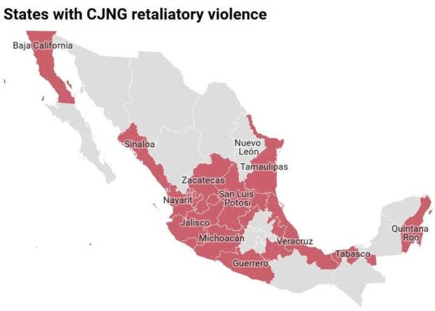 Most of the cartel violence involved arson attacks and blocking travel routes in and around the state of Jalisco where the raid took place. Some of the violence spread nationwide, but no tourists from any country were killed.